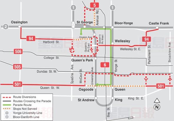 根據TTC推文,因St. Patrick’s Day遊行,本週日早8點到下午3點,3條公交車線路將改道,它們是5 Avenue Road, 94 Wellsley St, 和501 Queen St。TTC提醒乘客改換路線,并為行程預留多一些時間。(Charleen編譯)