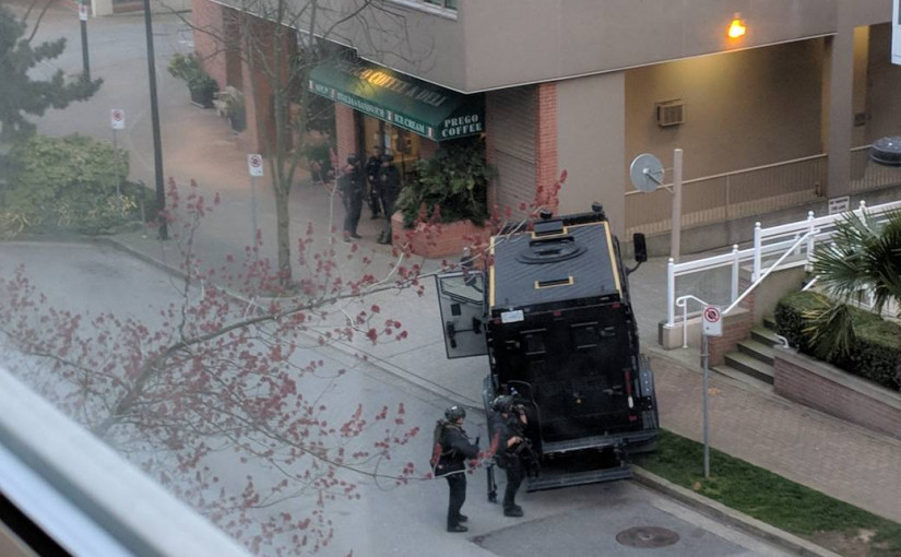 警方周三清晨4時左右接報,到Drake夾Hornby街附近一柏文單位,處理一宗家庭糾紛,警員到場後,一名男子逃走,並遺下一枝槍,警員追蹤到Hornby街夾Beach Avenue一柏文住宅,已封鎖現場,並正申請拘捕令,以採取行動。