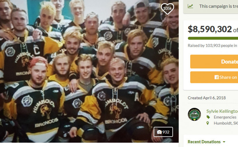 據加通社新聞報道,沙省洪堡青年冰球隊慘烈車禍發生后,GoFundMe網上籌款活動至今已經籌集善款$8,590,302。