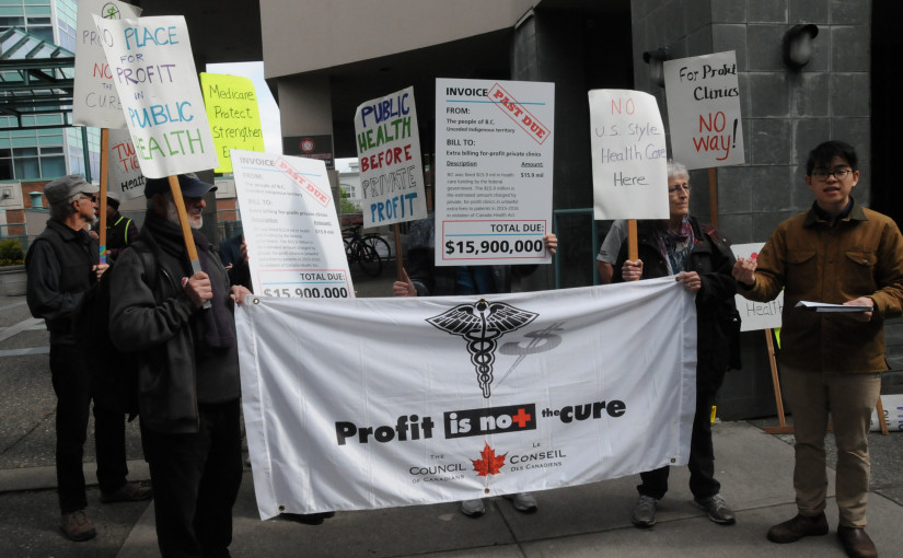 卑詩衛生聯會(BC Health Coalition)周二組織十多名示威者,前去溫市私營的福溪手術中心(False Creek Surgical Centre)門前,抗議有卑詩私營診所存在雙重收費行為。