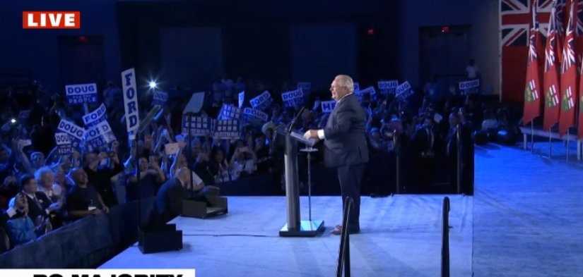 即將成為新一任安省省長的保守黨黨魁德加福特正在發表獲勝感言,他表示感謝團隊的支持,對支持者表示感謝。