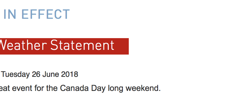 週二晚上,加拿大環境部發佈了特別氣象公告,稱長週末將是本季度最酷熱的時期。從週六到週一,體感氣溫將維持在40度以上。目前尚不明確熱浪何時結束,官方稱可能持續至下週三。