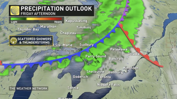 陣雨及雷暴風險從週五晚上持續到週六早晨,尤其在安省西南部及尼亞加拉地區。