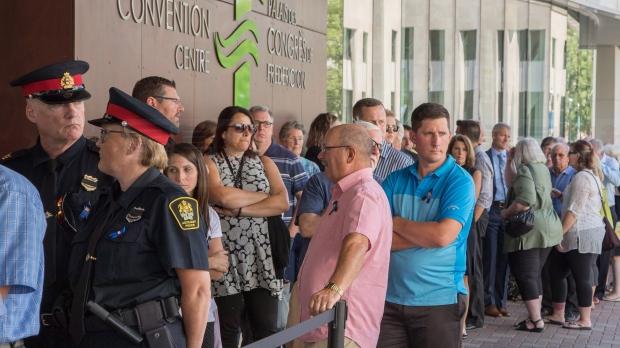 2018年8月16日,人們在the Fredericton Convention Centre外排隊等待和兩名警官遺體告別(加通社圖)
