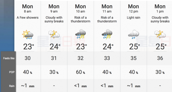 今天早上10點開始有60%的雷暴風險,雨量小於1毫米;下午2點,再次有40%的雷暴風險。今天的總雨量預計為2~4毫米。