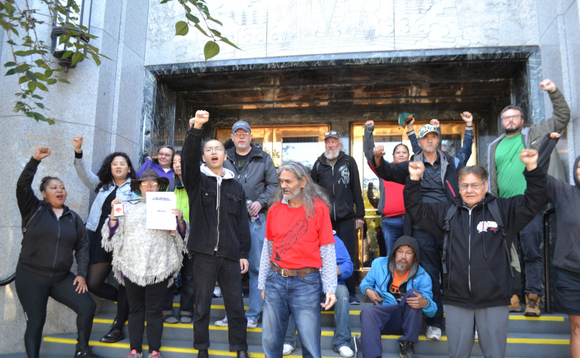 溫哥華市議會周二舉行在10月市選前最後一次公聽會,近20名「我們家園不能等待」(Our Homes Can’t Wait)聯盟支持者,計劃進入市議會,抗議溫市長羅品信(Gregor Robertson)未有兌現兩年前的承諾,在喜士定西街(W Hastings)58號興建百分百「福利金或退休金可應付」(Welfare or Pension Rates)租住單位,但未能進入,最後在溫市府大樓外集會喊口號後離去。