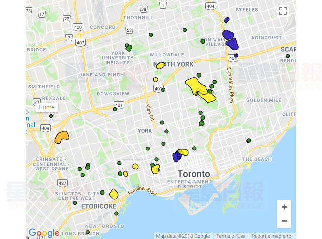 從多倫多電力局提供的斷電地圖可以看出,High Park附近的天鵝海區出現大面積斷電,1000人以上受到影響。