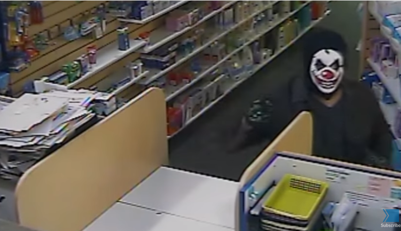 Shaheen跪在地上,舉起雙手做出投降的姿勢,戴小丑面具的搶劫犯對著空中揮舞了幾下刀之後迅速離開藥店。