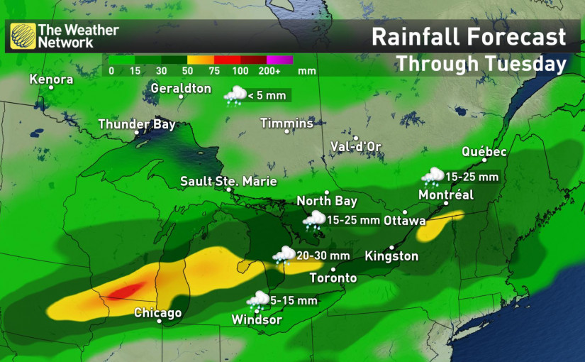 從週一晚上到週二全天,安省西南部到尼亞加拉半島有非嚴重雷暴風險。大多地區今日總雨量達20~30毫米,預計雨會下到週三才停。