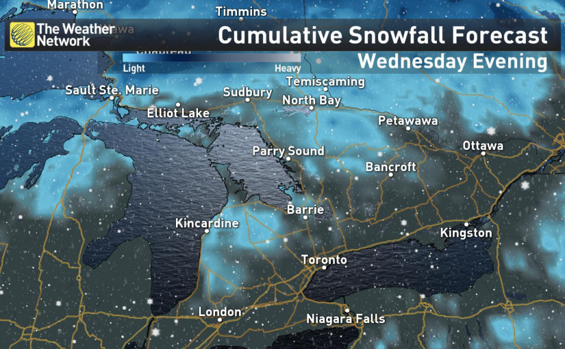 據Weather Network報道,今天安省會從黎明之前下雨到下午,東北地區還會降雪,休倫湖及喬治灣附近的地區可能有70km/h的強風。星期三安省會出現「秋季最冷天氣」。