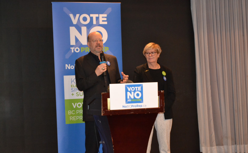 反對卑詩比例代表制協會兩名理事蒂勒曼(Bill Tieleman)以及蘇安彤(SuzanneAnton,前省司法及律政廳長),邀請前卑詩省長杜新志(Ujjal Dosanjh )、前自由黨省議員李燦明、中僑互助會創會主席葉吳美琪、全加華聯全國執行主席、全加華聯(太平洋區)共同主席蔡宏安,共同出席華埠記者會,他們呼籲華裔社群在公投中投下反對票,不能讓比例代表制通過,不然會對移民社群不利。