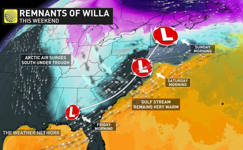 本週末,出自於颶風Willa殘餘的一個嚴重風暴將沿美國東海岸上移。氣象學家Gillham預測,這一天氣系統會在週六和週日給五大湖地區帶來降雨。