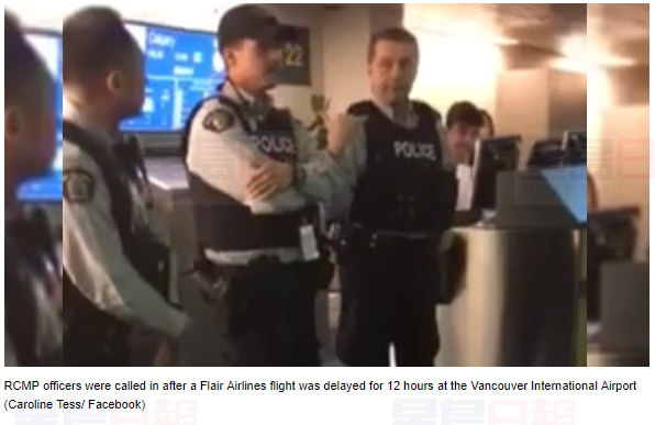皇家騎警發言人Dawn Roberts說,警官是接報警前往處理登機口的一起騷亂事件。幾名警官傾聽了乘客們的擔心,並向他們提供了信息和建議。