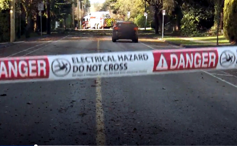 上周四(12月20日)發生風暴當天,位於登巴街(Dunbar St.)夾西南海旁道(Southwest Marine Dr.)附近的一條電纜折斷,消防人員到場處理,並且封鎖附近一帶範圍。根據一段視頻顯示,一輛汽車未有理會,駛過封鎖區域。