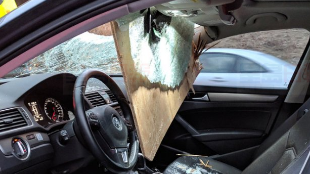 安大略省警方表示,一塊木夾板從一輛車上飛下並插進另一輛私家車的擋風玻璃內,三名車內婦女大難不死「幸運存活」。