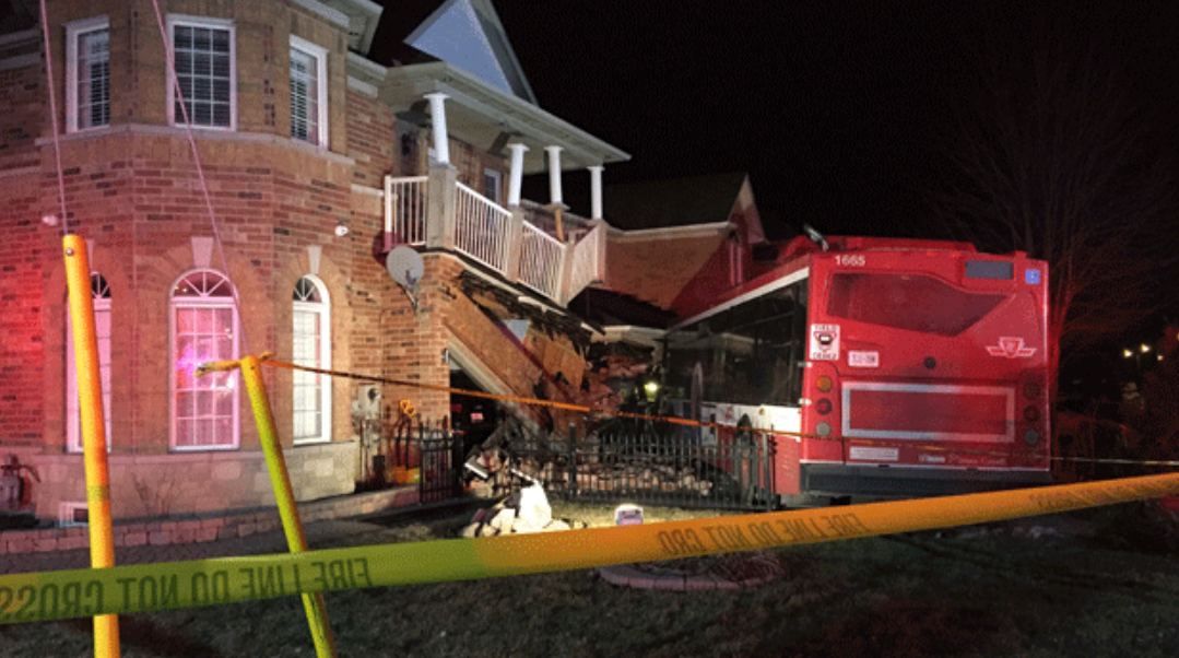 今日凌晨大約1時40分,警方接報一輛巴士撞向士嘉堡介乎McNicoll與Morningside大道交界附近Oasis Boulevard的兩座獨立屋,令物業建築造成嚴重破壞。