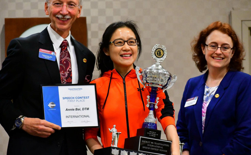 國際教育機構Toastmasters International(TI) 2019年度演講比賽,在安省86賽區的比賽於日前完成,居住在密西沙加的華人女子白雲(Annie Yun Bai,上圖中),作為唯一一晉級的華人與其他9個賽區的獲勝者同場競賽。十位選手都是從各自的小區出線,最後白雲獲得這場演講比賽總冠軍,將有望參加今年夏天在Toastmasters美國總部舉行的的全球演講比賽。