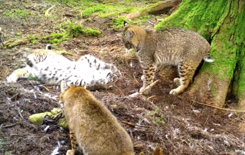 看過山貓出沒嗎?大溫滿地寶市(Port Moody)今年冬天捕捉到有三隻啃食著鹿的屍體的畫面。Mossom Creek孵化場周一將這段影片放上了網。