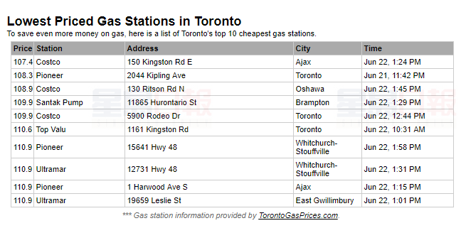 今天快加油 明天油價大漲3分 根據storkr油價網站消息,多倫多平均油價明天(6月23日)將大漲3分,從今天的120.9分/升漲到123.9分/升。 上圖為多倫多及周邊十個最便宜的加油站。司機們今天如果路過這些加油站,不妨給愛車加滿油。 (網頁截圖)T04