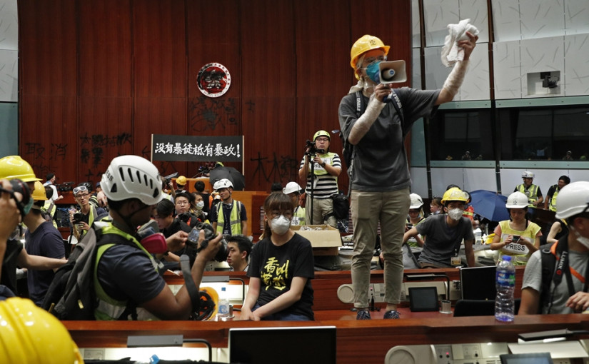 至晚上9時,數百名示威者衝入立法會大樓內,在大樓的警察退守,沒有制止示威者進內。示威者衝入立法會大樓後,闖會議廳塗黑香港特區區徽,並掛有橫額,橫額上寫著「沒有暴徒,只有暴政」,及「萬劫不復,退無可退」等字樣。