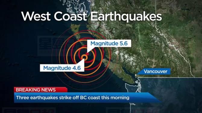 卑詩省中部沿岸地區周五清晨錄得三次地震,沒有受傷損毀報告。