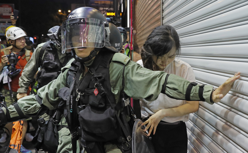Police detain a girl during a confrontation in Hong Kong on Saturday, Aug. 10, 2019. Hong Kong is in its ninth week of demonstrations that began in response to a proposed extradition law but have expanded to include other grievances and demands for more democratic freedoms.(AP Photo/Kin Cheung)