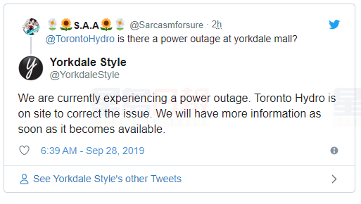 準備去逛商場的人們請注意,Yorkdale Shopping Centre全面斷電。目前多倫多電力局正在進行搶修。