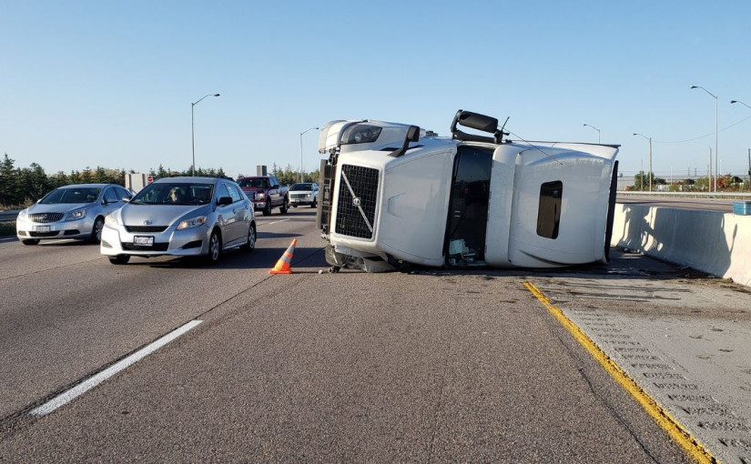 省警表示,周日早上一輛沿401號高速公路東行線行車的貨車,駛至接近James Snow時,貨車突然翻側,橫臥在最左邊一條行車線上。