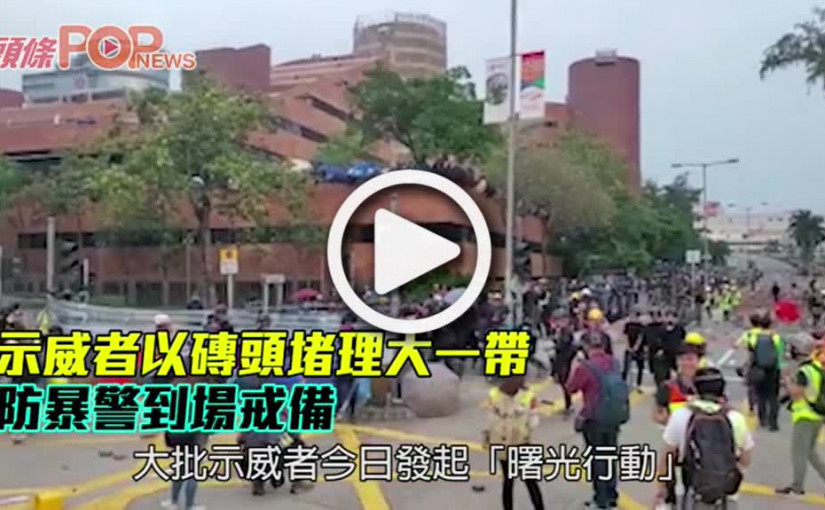 示威者以磚頭堵理大一帶 防暴警到場戒備