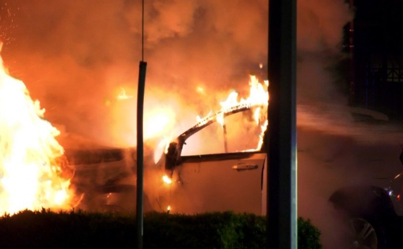 據CTV電視報道,周六凌晨3時,位於界限街(Boundary Rd.)夾亨寧街(Henning Dr.)路口處,發生兩車相撞意外,其中一輛白色四驅車失控撞入路邊樹叢。四驅車此後燃起大火,火舌不斷自車窗向外延伸。
