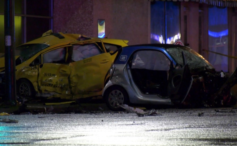 根據溫哥華警方表示,該事件發生周日凌晨三點半左右,在東1街(First Avenue)夾蘭弗里街(Renfrew Street)的交叉口,當時有一輛Car2go共享汽車與一輛載有兩名乘客的Yellow Cab發生碰撞。的士在事故中撞入路口的皇家銀行,建築物受到毀損。