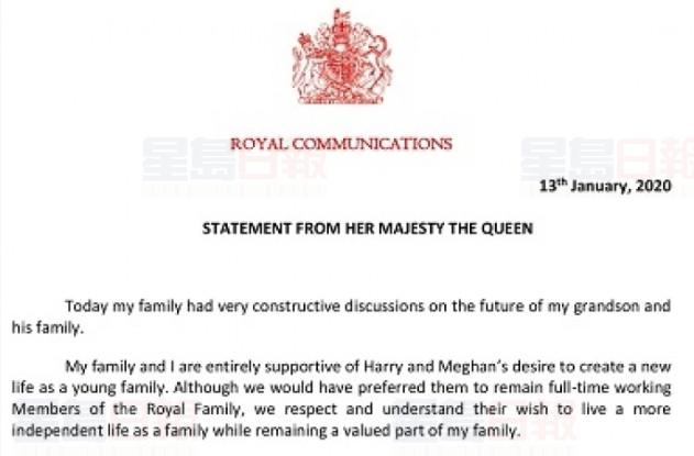 英女王期望哈里王子及梅根保留王室成員身份,但尊重追求獨立生活的意願,同意讓兩人將部分時間放在加拿大的生活。