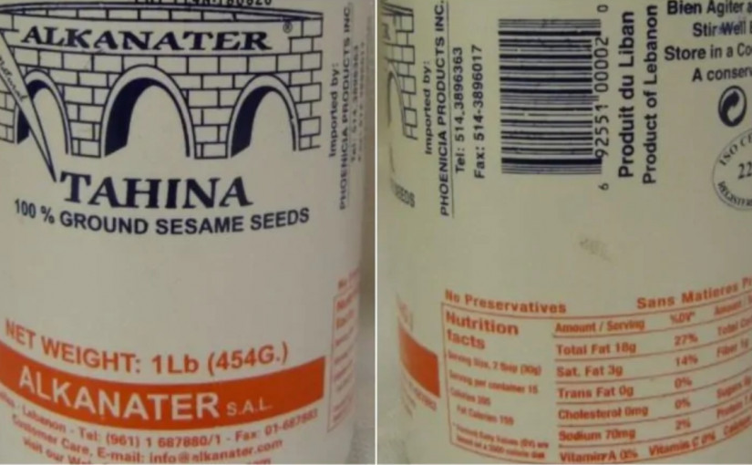 Phenicia集團正回收Alkanater品牌芝麻醬Tahina,原因是該產品可能受到沙門氏菌的污染。