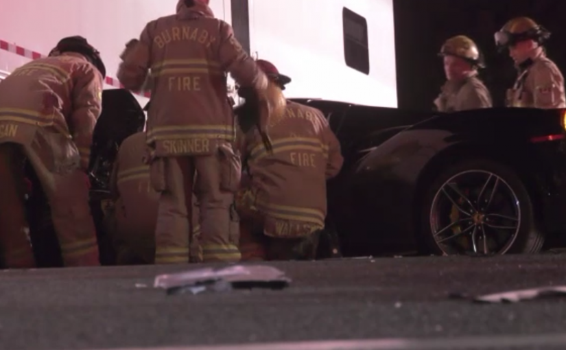 據CTV電視報道,意外於周六凌晨2時半,在加拿大街(Canada Way)以南不遠處的威靈頓街(Willingdon Ave.)上發生。一輛黑色法拉利失控鑽入貨櫃車的車底,聞訊趕來的消防員需要動用救生鉗將法拉利車體切開,才將車內兩人救出。