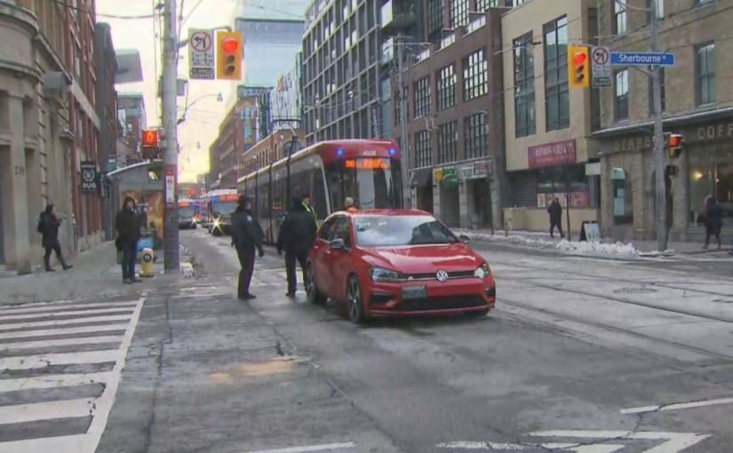 多倫多警隊表示,事件發生於周五(28日)上午大約7時,1名乘搭街車的男子,在King街與Sherbourne街下車時,遭剛駛經的1輛紅色福士房車撞倒。