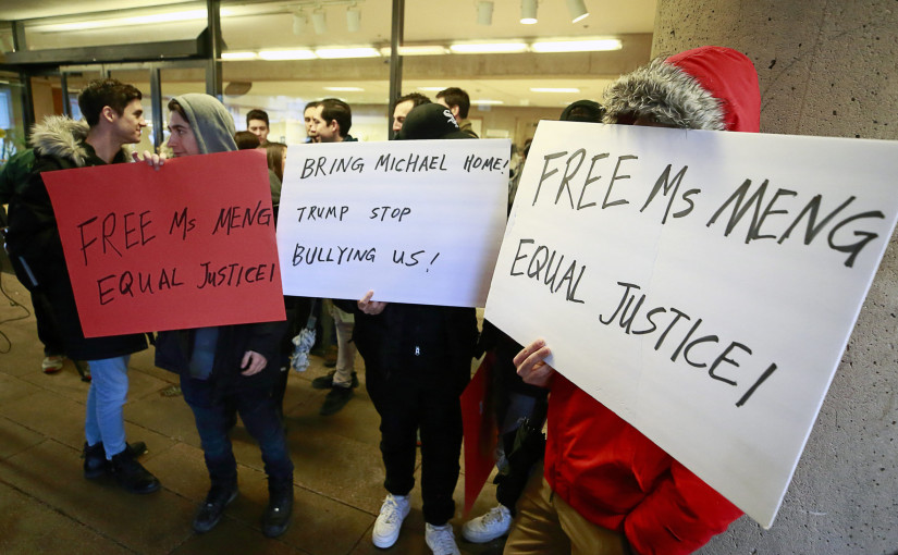 (2019年1月孟晚舟案件開庭時,有一群非華裔舉牌支持孟晚舟。)