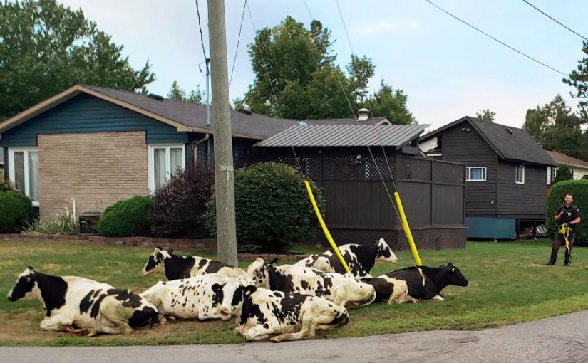 省警指出,周三早上大約8時30分,接報位於渥太華以北,僅45分鐘車程的Russell社區內,發現有1群乳牛「遊蕩」;而根據省警在推特貼出的圖片可見,有1名省警正看守霸佔了1個民居前院的7隻乳牛。