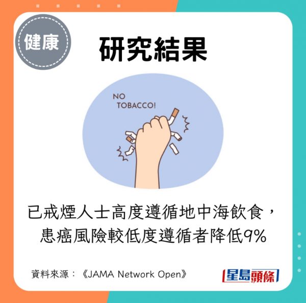 - 已戒煙人士若高度遵循地中海飲食,患癌風險較低度遵循者降低9%