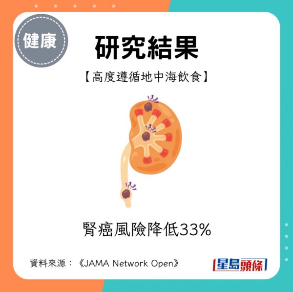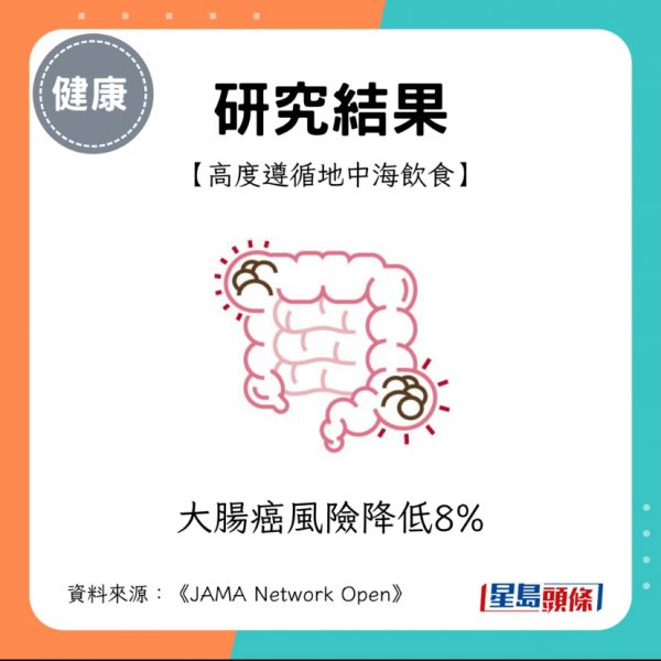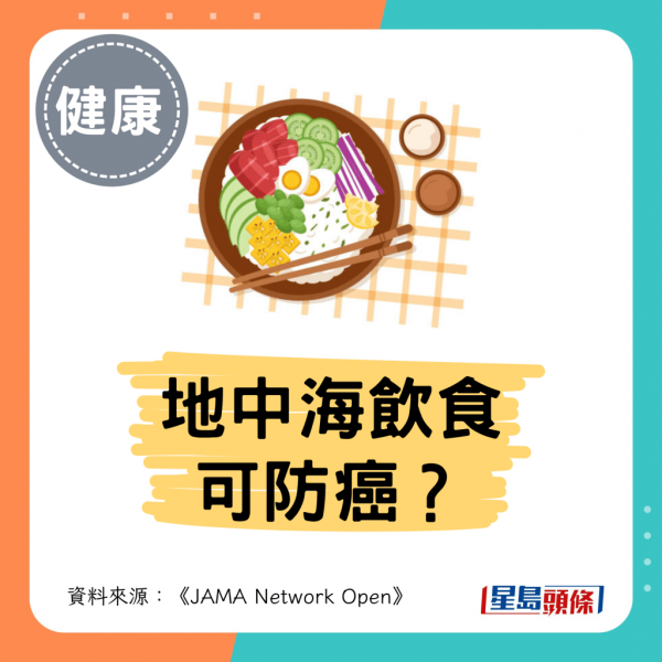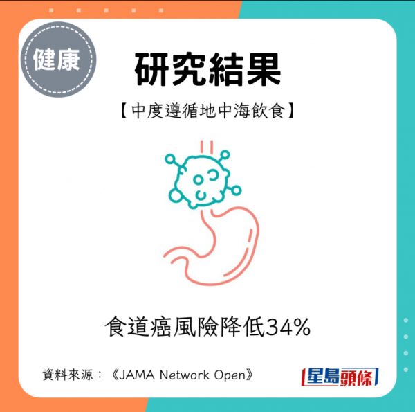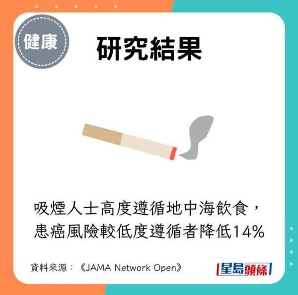 - 吸煙人士若高度遵循地中海飲食,患癌風險較低度遵循者降低14%