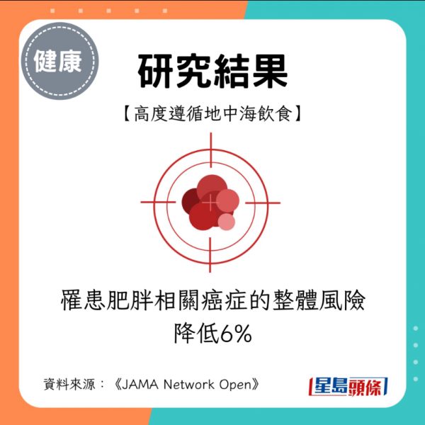 - 高度遵循地中海飲食的參加者,罹患肥胖相關癌症的整體風險降低6%