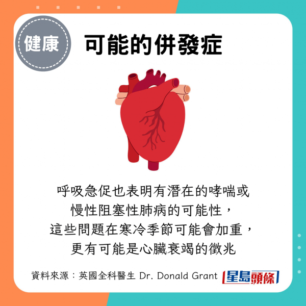 患流感時呼吸急促和胸痛雖然常見,但也可能是發展成更嚴重疾病的跡象,例如肺炎。呼吸急促也表明有潛在的哮喘或慢性阻塞性肺病的可能性,這些問題在寒冷季節可能會加重,更有可能是心臟衰竭的徵兆。因此務必去看醫生,尋求進一步的診斷,萬一延誤治療,可能會導致感染加劇或增加住院的風險。