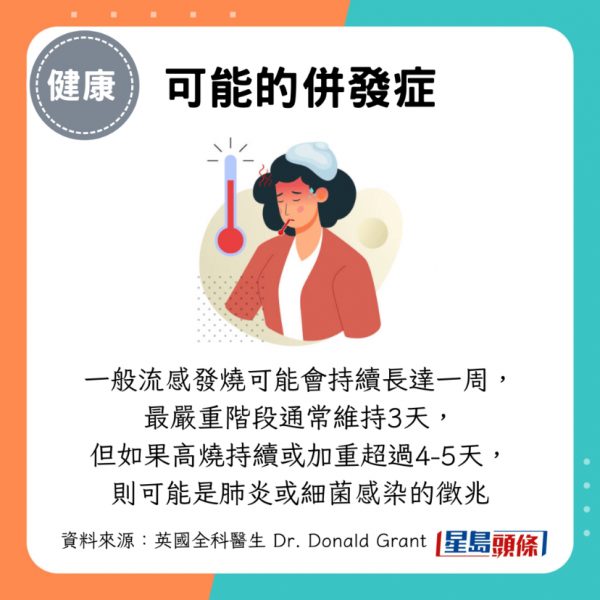 一般流感發燒可能會持續長達一周,最嚴重階段通常維持3天。但如果高燒持續或加重超過4-5天,則可能是肺炎或細菌感染的徵兆,如果感染會擴散到血液中,恐引發危及生命的敗血症。持續發燒是身體正在對抗感染或疾病的明顯訊號,需要就醫,不能忽視。