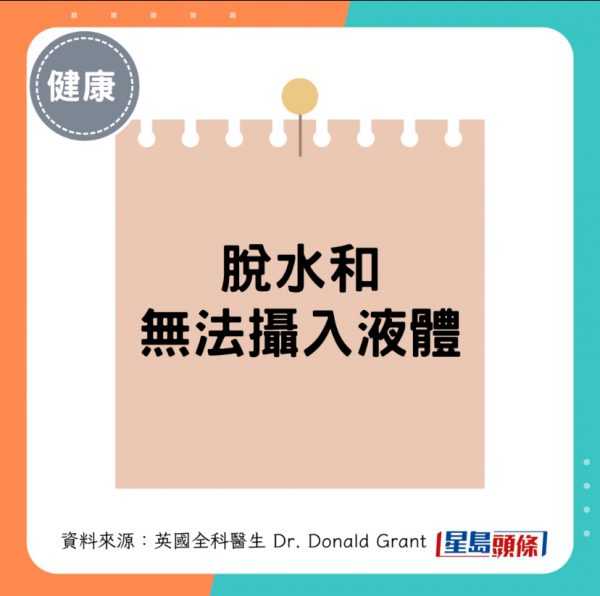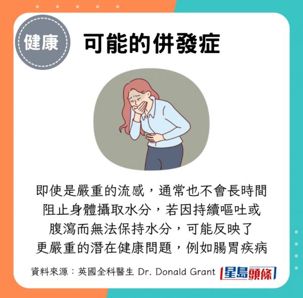 出汗、呼吸急促而淺、嘔吐和腹瀉都會導致體液和電解質迅速流失,嚴重影響人體水分含量。但即使是嚴重的流感,通常也不會長時間阻止身體攝取水分。如果由於持續嘔吐或腹瀉而無法保持水分,可能反映出現了更嚴重的潛在健康問題,例如腸胃疾病。一些非處方藥物可以幫助補充流失的體液,不過更建議求醫,由醫生提供更符合個人病情的治療建議和藥物。