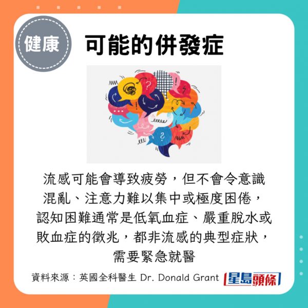 生病時不像平日的自己般清醒是很正常的,但如果突然感到困惑、無法集中注意力或出現其他認知問題,就需要認真重視。因為流感可能會導致疲勞,但不會令意識混亂、注意力難以集中或極度困倦。認知困難通常是低氧血症、嚴重脫水或敗血症的徵兆,這些症狀都並非流感的典型症狀,需要緊急就醫,不可視作普通的流感症狀而置諸不理。