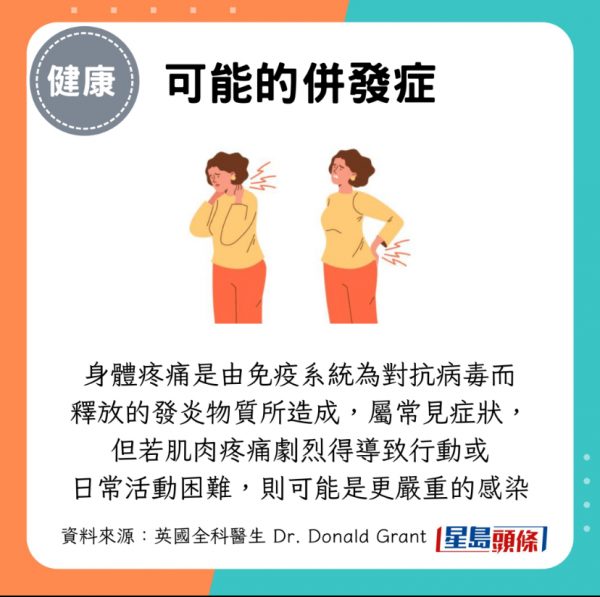 • 高風險人士:長者、小朋友或免疫力較低人士受感染後,可能會出現支氣管炎或肺炎,甚至腦炎、心肌炎或心包膜炎等併發症,最嚴重可致命。