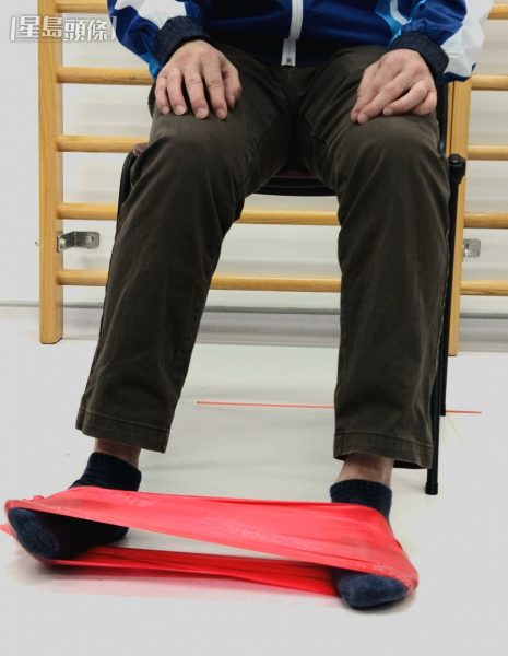 • 雙腳分開拉緊阻力帶,患側腳掌維持向外側用力,以對抗阻力帶的拉力