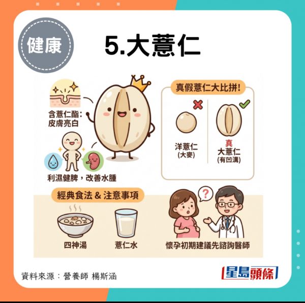 含有薏仁酯,長期吃有助令皮膚變得亮白;中醫角度亦常說它能利濕健脾,因此容易水腫的人可以適量攝取。市面上光滑小顆的洋薏仁其實是大麥,真正能排水的是這種中間有明顯凹溝的「大薏仁」。建議用作煲四神湯、薏仁水都是經典食法,而懷孕初期建議先諮詢醫師再食用。