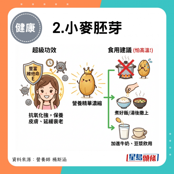 雖然只佔小麥極少部分,但卻濃縮了大部分的營養精華,例如含豐富維他命E,且抗氧化能力強,有助保養皮膚、延緩衰老。由於小麥胚芽富含油脂,非常怕高溫,建議最好在煮好飯或湯後再直接撒上,或者加進牛奶、豆漿裡飲用。