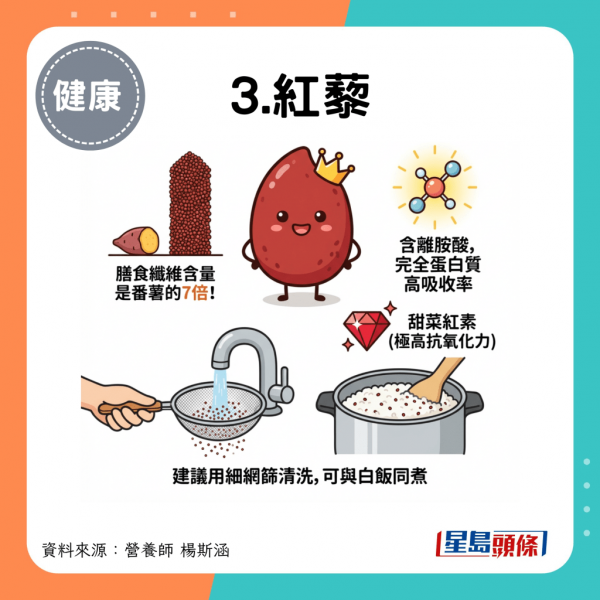 紅藜膳食纖維含量是番薯的7倍,而且含有一般穀類少見的離胺酸,屬於吸收利用率高的完全蛋白質。其美麗的紅色來自甜菜紅素,抗氧化力極高。由於紅藜顆粒很小,建議清洗時記得要用細網篩,可直接跟白飯一起煮。