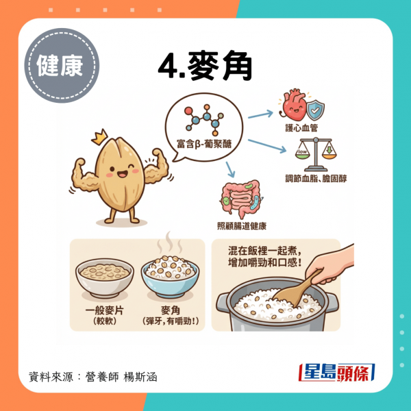 富含β-葡聚醣,有助調節血脂、膽固醇、護心血管和照顧腸道健康。麥角口感比一般麥片更彈牙,混在飯裡一起煮,能增加嚼勁和口感。